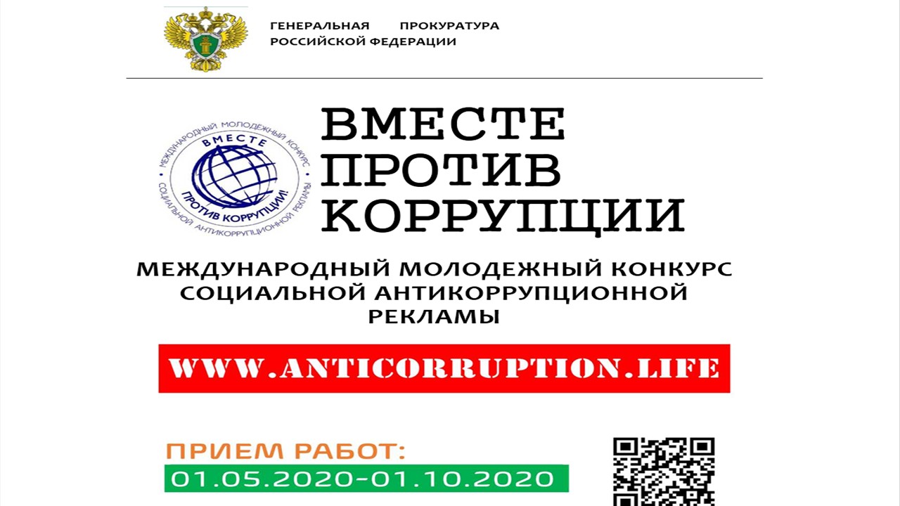 06.05.2020Генеральной прокуратурой Российской Федерации в текущем году организован Международный молодежный конкурс социальной антикоррупционной рекламы на тему «Вместе против коррупции!»