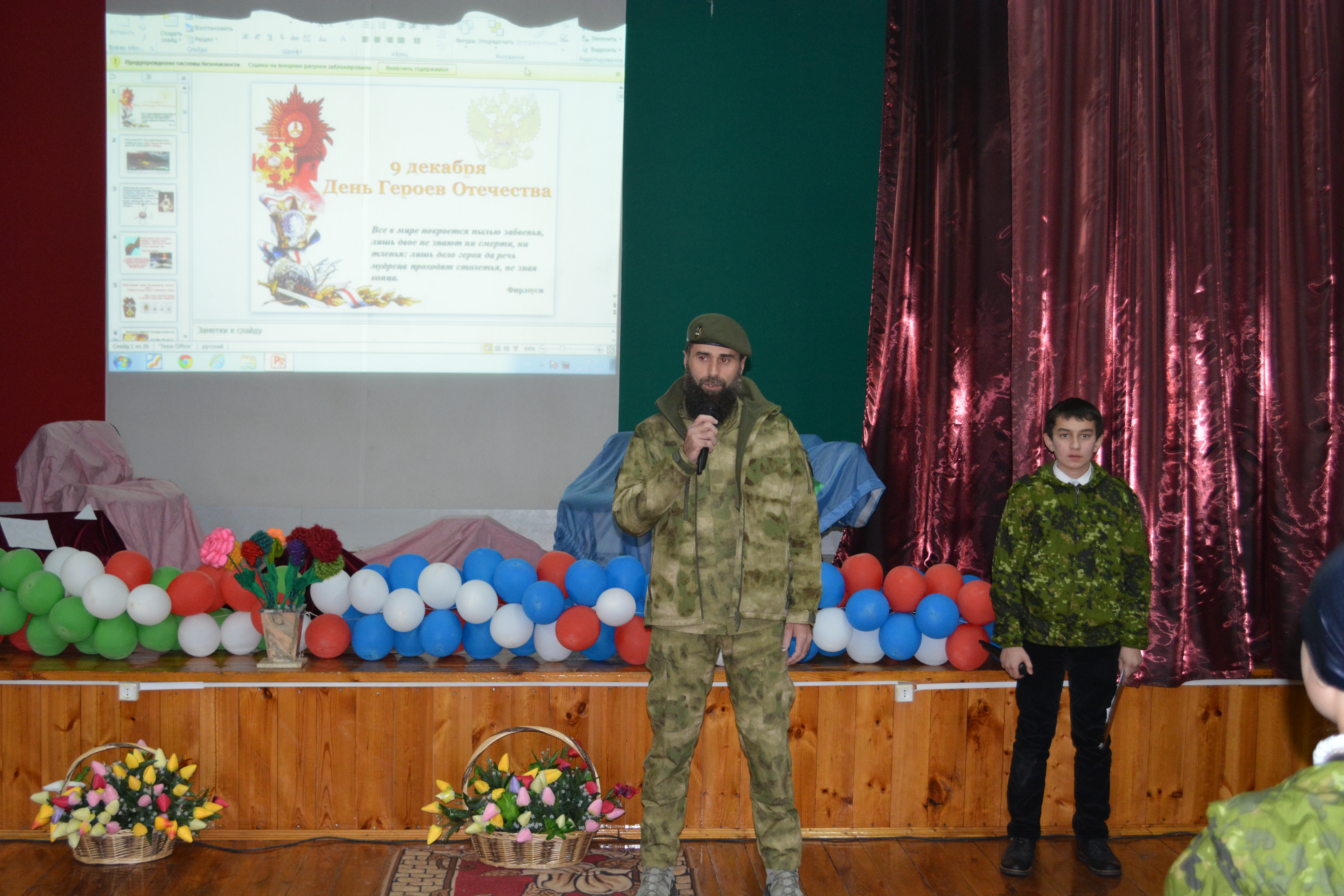 09.12.20169 декабря 2016 года в МБОУ «СОШ с. Беной-Ведено» было проведено мероприятие, посвященное Дню героев Отечества. Силами учащихся школы были организованы художественные номера: стихи о героях, песни о войне. В докладах, приготовленных учащимися 8 классов, прозвучала тема патриотизма.
