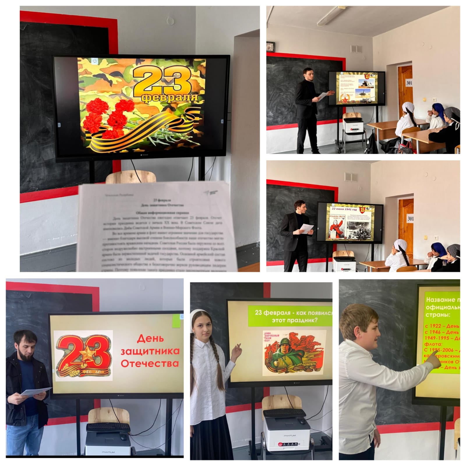 22.02.2024В МБОУ «СОШ с. Беной-Ведено» классные руководители совместно с Отделом по Ножай-Юртовскому району УФСБ России по Чеченской Республике провели тематические мероприятия ко Дню защитника Отечества. 23 февраля – это праздник для всех мальчиков, юношей, парней и мужчин. В честь этого события во всех классах были проведены викторины, КВНы, выставки рисунков и уроки мужества