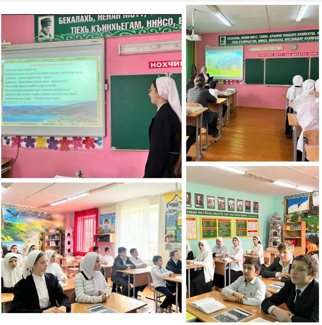 Глава Чеченской Республики, Герой России Р. А. Кадыров сказал: «Без родного языка невозможна любовь к своей земле, народу, Отечеству». Истинная любовь к своей стране немыслима без любви к своему родному языку. Каждый человек с детства начинает говорить, мыслить, рассуждать на родном ему языке. 23 апреля в седьмом классе прошел открытый урок, посвященный Дню чеченского языка. На уроке ребята узнали об истории этого праздника, о значении родного языка для каждого из нас. В исполнении учеников прозвучали стихотворения на чеченском языке. Дети читали отрывки из произведений Абузара Айдамирова, Магомеда Сулаева, Билала Саидова, Магомеда Сулаева и других писателей. Никто не остался равнодушен к празднику, потому что нет равнодушных к своему языку. Р.Кадыров: «Без родного языка невозможна любовь к своей земле, народу, Отечеству»