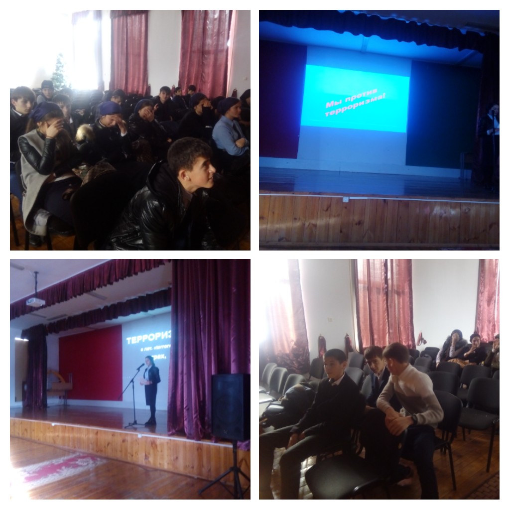 22.01.201822 января в актовом зале школы состоялось мероприятие по профилактике экстремизма и терроризма для учащихся 9-11 классов. Лекцию подготовил и провел заместитель директора по ВР Абреков А. М., в роли ведущей выступила ученица 9а класса Хатаева Кесира. Мероприятие проводилось с целью формирования уважительного отношения к различным этнокультурам и религиям, осведомленности в нормативно-правовой базе противодействия терроризму. Старшеклассники проявили неподдельный интерес к предложенному материалу и эмоциональную зрелость, показали себя настоящими патриотами своей Родины.