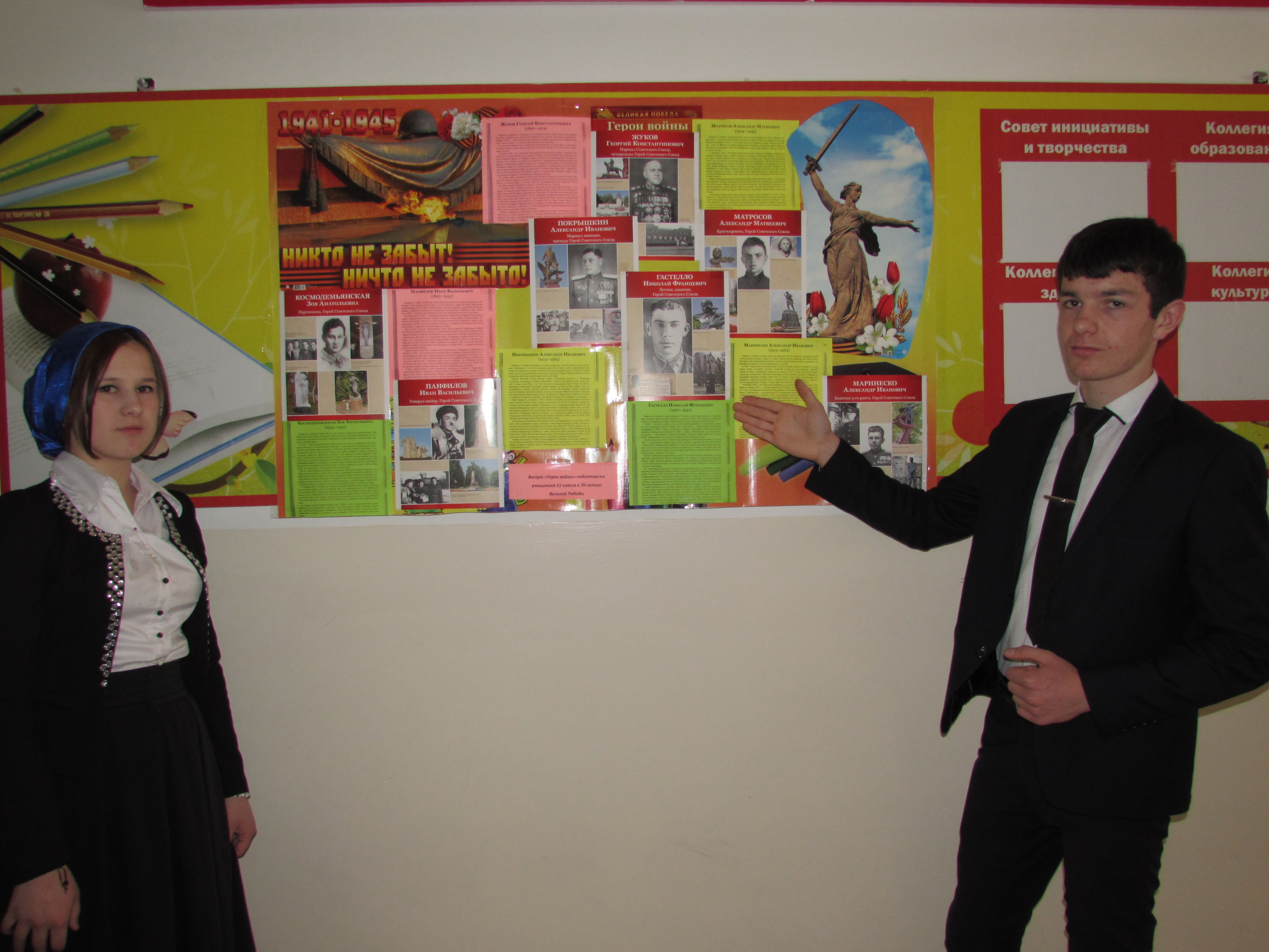 Старшеклассники поместили на нём портреты героев Великой Отечественной войны с их биографией и описанием подвига. Стенд украшен изображениями могилы Неизвестного солдата и Родины-матери. Помещён стенд в вестибюле школы.