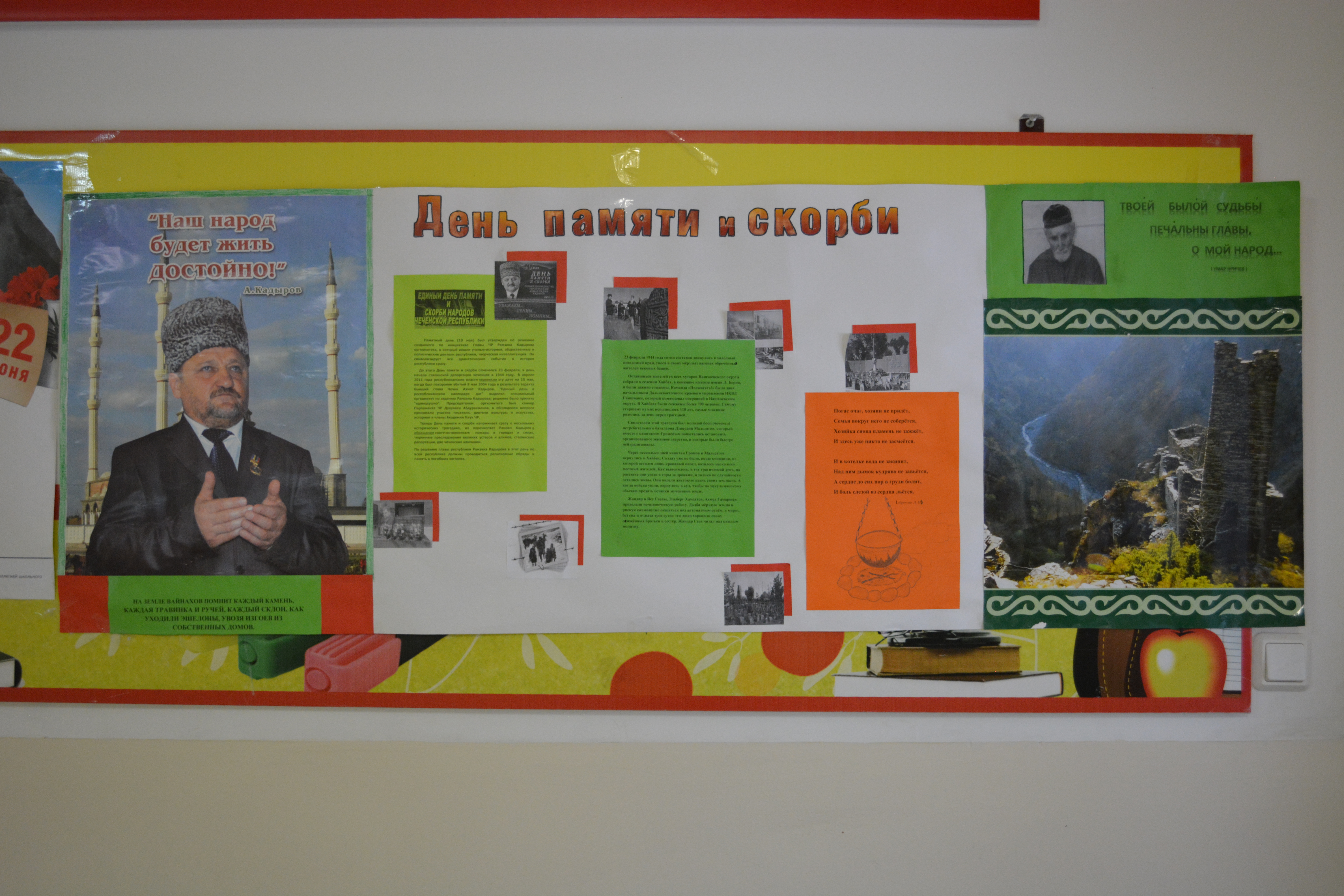 Выпущены классные газеты о депортации чеченского народа в 1944г. Также А-Х. Кадырову был посвящён конкурс чтецов «Ушедший непобеждённым». На эту же тему в актовом зале школы было проведено общешкольное мероприятие. Завершающим мероприятием стала поездка лучших учеников школы в Мемориальный комплекс им. А-Х Кадырова.