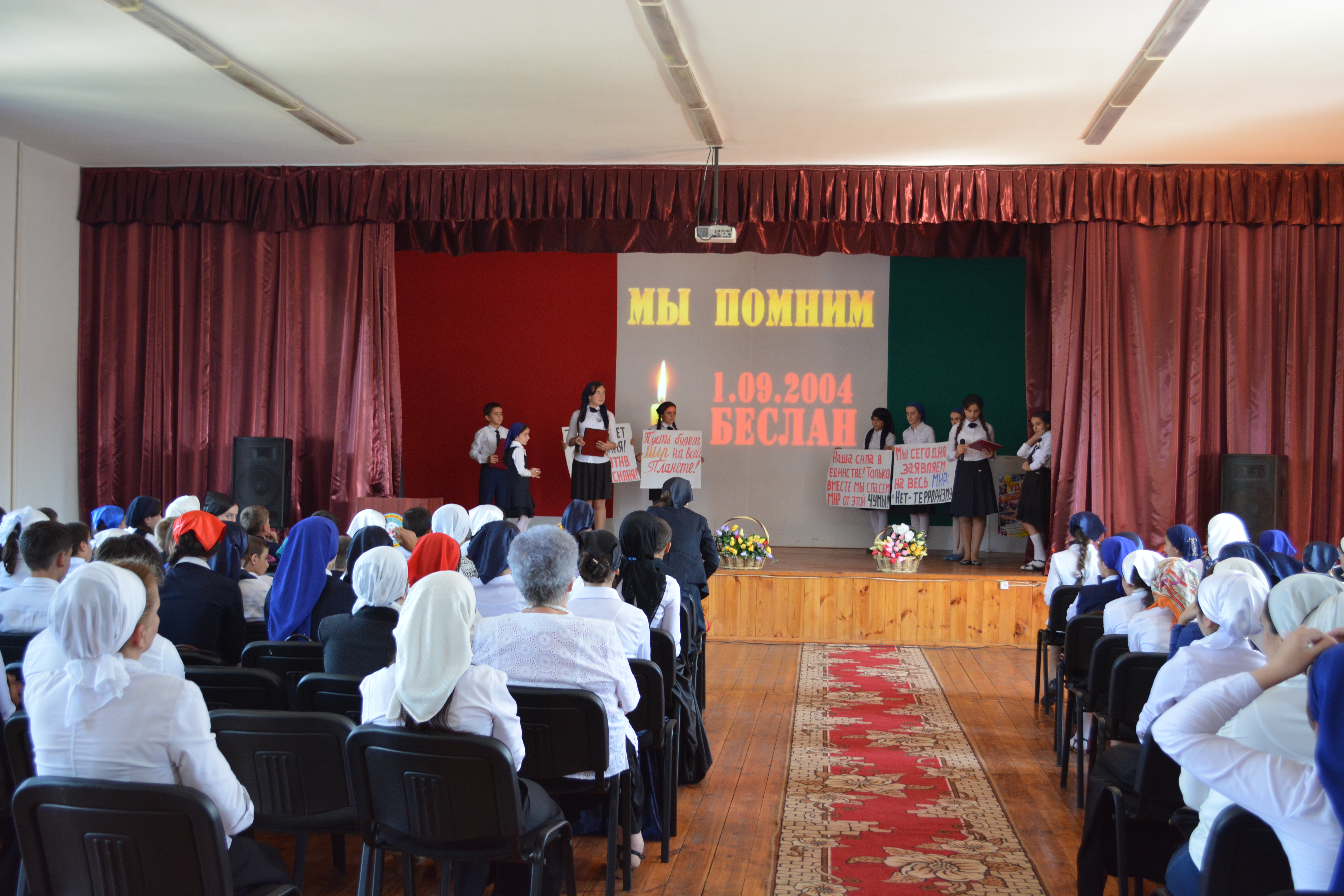 03.09.2015Третьего сентября в актовом зале школы был проведён торжественный митинг, посвящённый Дню солидарности в борьбе с терроризмом. Со сцены было рассказано о трагедии Беслана, показаны снимки этих страшных дней.
