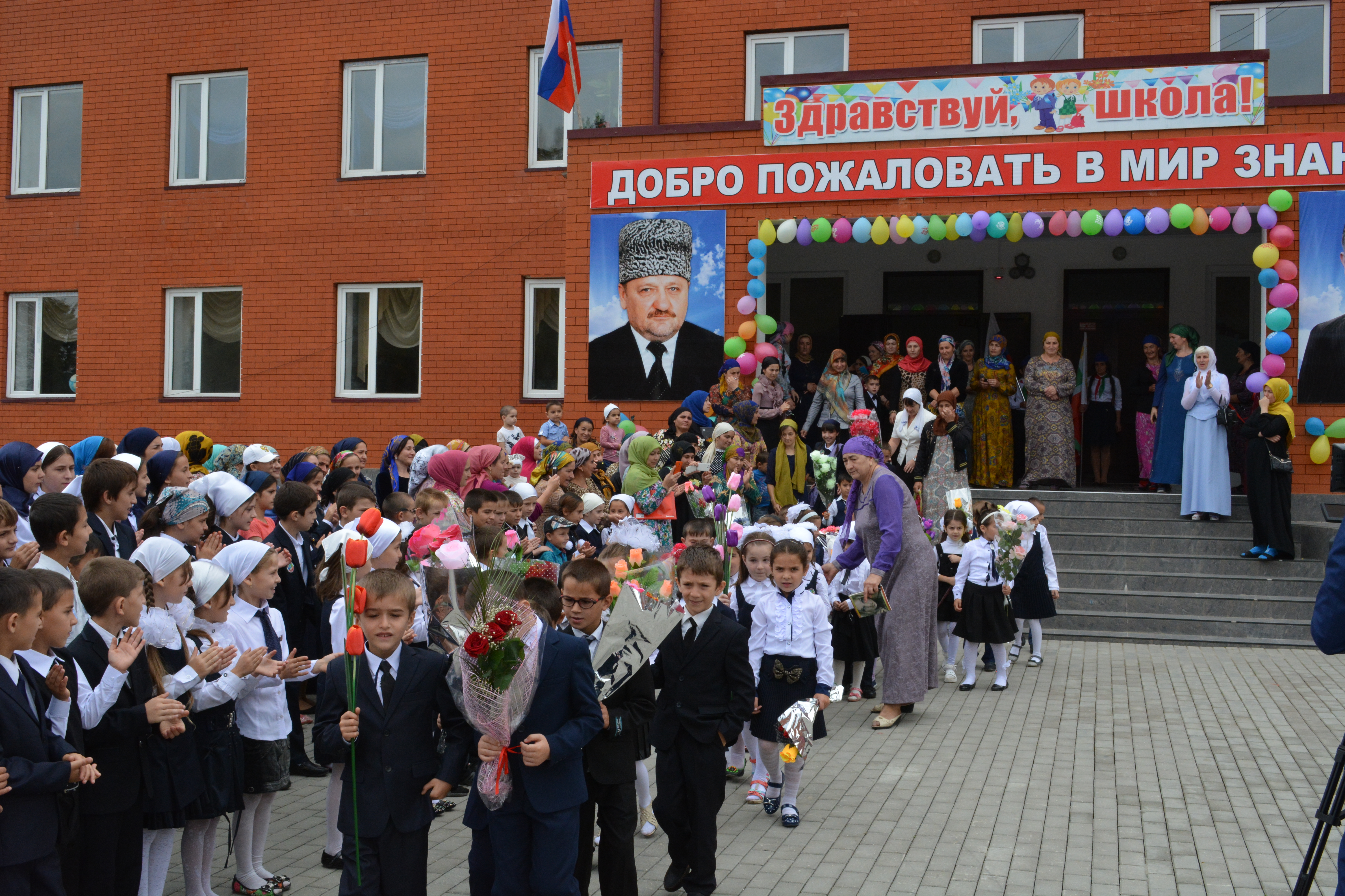 Первым сентябрьским утром во дворе школы прозвучали гимны России и Чечни, под звуки которых перед собравшимися на линейку торжественным шагом были внесены знамёна.