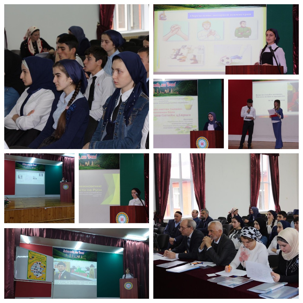 из области лингвистики - «Английские и чеченские пословицы и поговорки: сходство и трудности перевода» (Хатаева Кесира), «Возникновение письменности на Руси» (Калаева Фатима), «Названия даров природы» (Курбанова Асет); из области естествознания - «Путешествуя по России, я познаю мир. Туристический маршрут «Сказка, заблудившаяся в горах» (Хасханова Раяна), «Загадки полушарий головного мозга» (Зунибаева Залина), «Периодическая система Менделеева: вчера, сегодня, завтра» (Калаева Хава).
